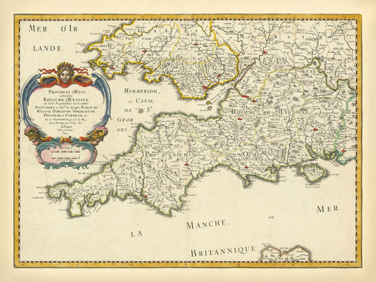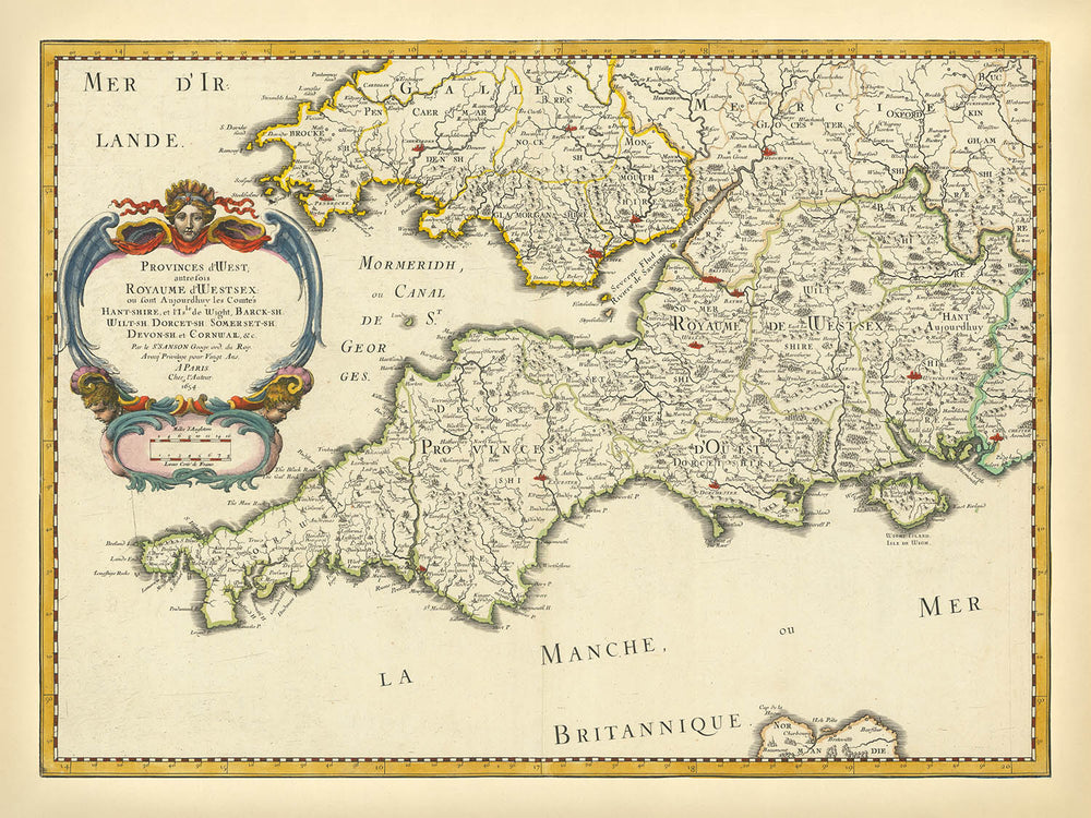 Step into the captivating world of 17th-century cartography with Nicolas Sanson's exquisite map, "Provinces d'West, autrefois Royaume d'Westsex." This masterful creation from 1654 beautifully illustrates the historical region of Wessex, a significant area in the southwest of England. Sanson, a leading figure in French cartography, meticulously captured the essence of this ancient kingdom, which once encompassed the counties of Hampshire, including the Isle of Wight, Berkshire, Dorset, Somerset, Devon, and Cornwall. His work not only serves as a geographical guide but also as a window into the rich tapestry of England's past.