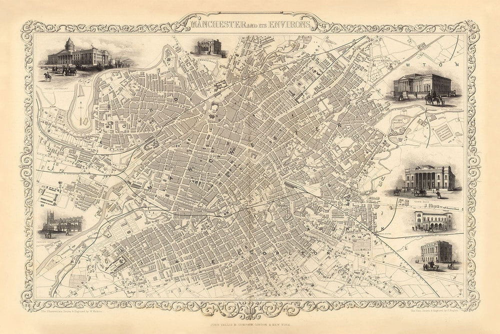 Engraved by John Rapkin and published by J. Tallis & Co in 1851, this is one of the finest and most detailed historic maps of Manchester that you can find from the peak of industrialised Victorian Britain.