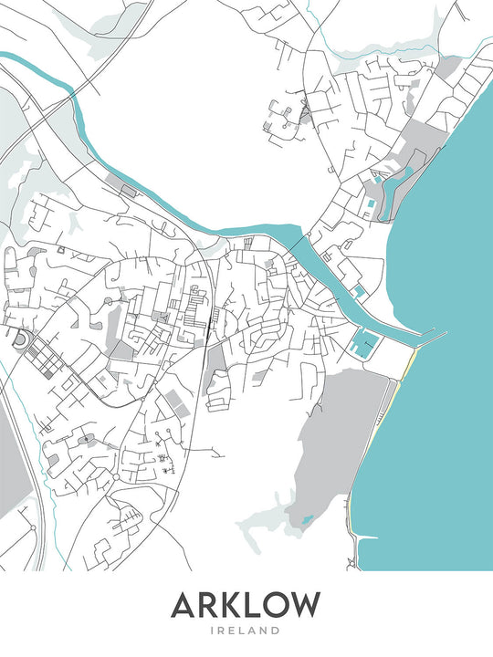 Modern Town Map of Arklow, Ireland: Castle, Harbour, Lighthouse, Avoca Mines, Ballyarthur House