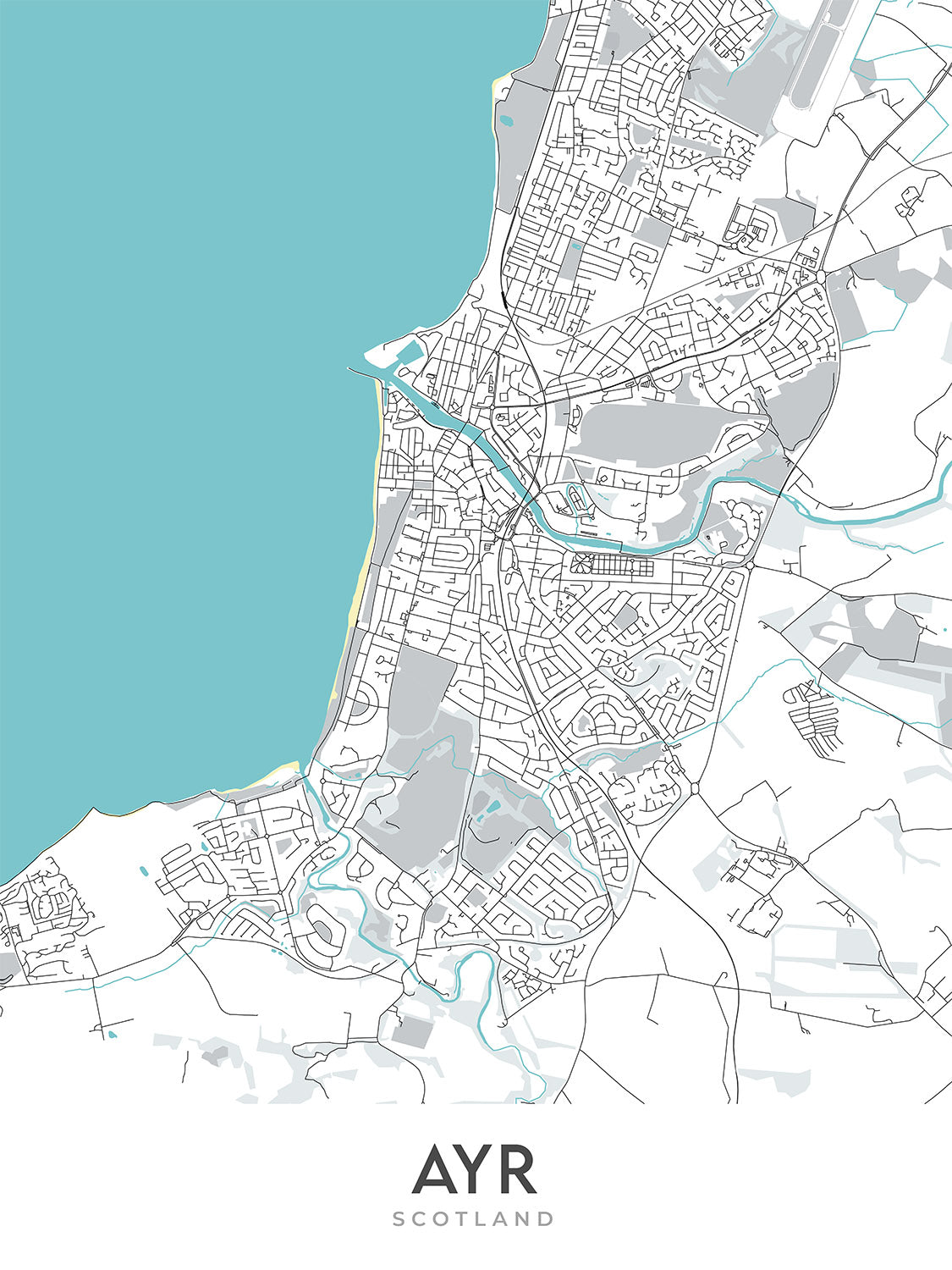 The landmarks of Ayr, both natural and man-made, are seamlessly integrated into this map, offering a visual journey through some of the city's most iconic sites. From the scenic Ayr Beach and the tranquil flow of the River Ayr to the historical allure of the Auld Kirk of Ayr and the grandeur of Ayr Town Hall, these landmarks enrich the map with layers of meaning. This piece not only enhances your space but also invites you to explore Ayr's heritage and beauty from the comfort of your home.