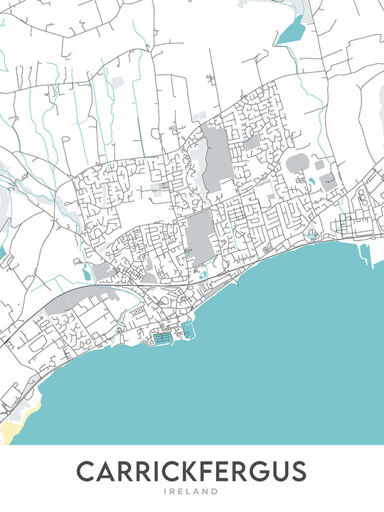 This map of Carrickfergus in Northern Ireland is a modern, detailed street map without labels. The map focuses on the city of Carrickfergus and its surrounding areas, providing an accurate and visually appealing representation of the region. The map covers a wide range of neighborhoods, including Carrickfergus, Eden, Woodburn, Joymount, Kilroot, Mount Merrion, Seapark, Woodlawn, and Woodside.