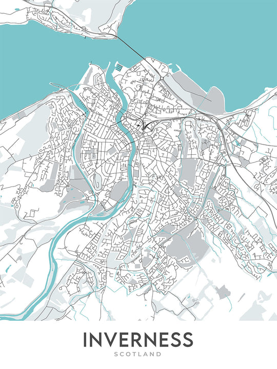 Discover the captivating allure of Inverness with this meticulously crafted modern map, designed to capture the essence of this vibrant Scottish city. This map, the brainchild of The Unique Maps Co., presents an intricate, label-free street layout that invites viewers to get lost in the urban tapestry of Inverness. Encompassing prominent neighborhoods such as the historic City Centre, the serene Crown area, and the bustling Merkinch, this artwork offers a unique perspective on the city's diverse landscape. The map’s boundaries extend to include charming residential areas like Lochardil and Culduthel, providing a comprehensive overview of Inverness's urban sprawl.