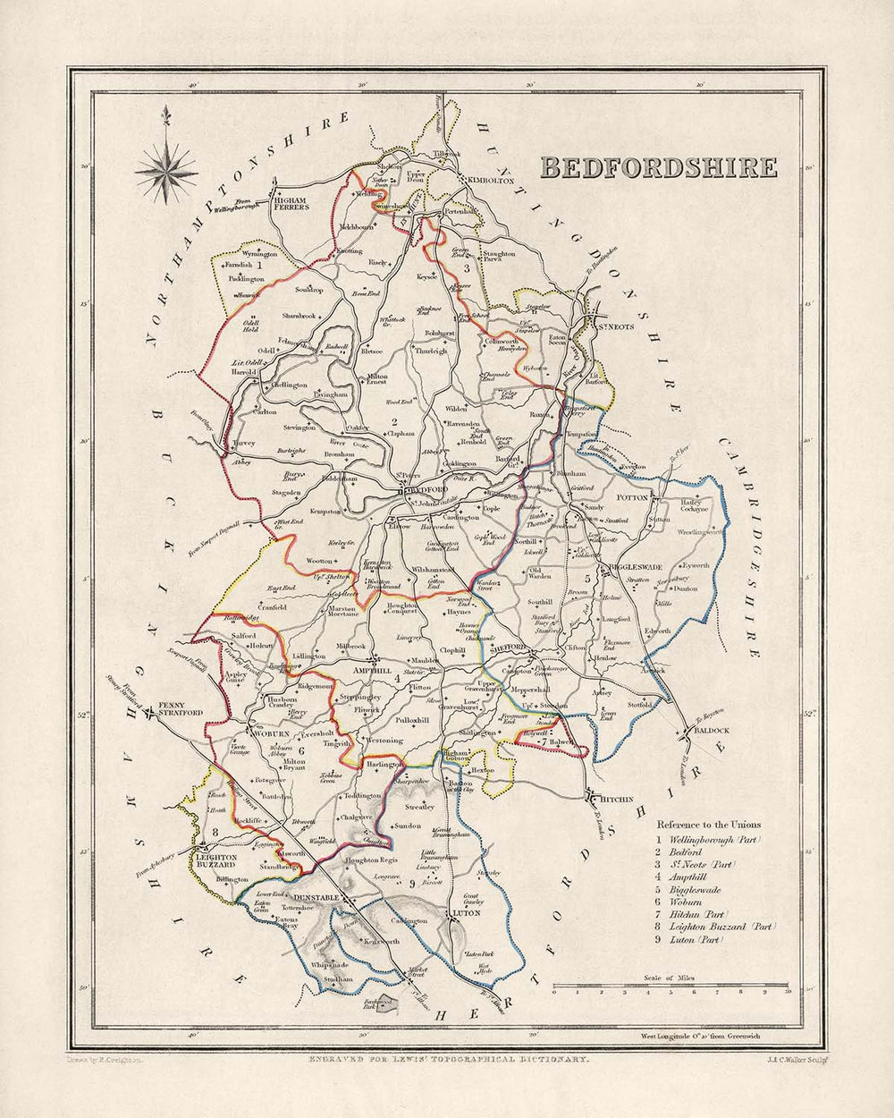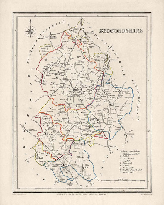 The Old Map of Bedfordshire by Samuel Lewis in 1844 is a captivating and historically significant piece that offers a glimpse into the past. This meticulously crafted map showcases the County of Bedfordshire, England, during a time of great change and development. It presents a unique opportunity to explore the region's rich history, as well as the evolution of its towns and cities.