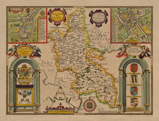 This old, full colour and exceedingly rare map shows the ancient county of Buckinghamshire in 1611. It was created by John Speed and engraved by Jodocus Hondius, and originally published in Speed's "The Theatre of the Empire of Great Britaine".