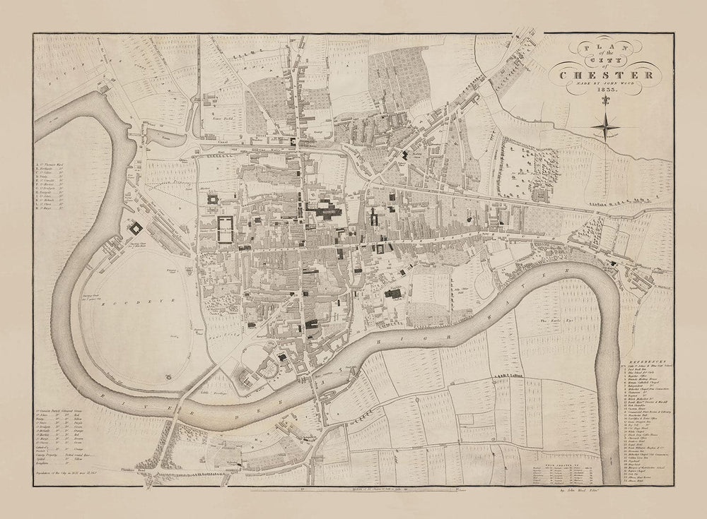 This old, exceedingly rare city plan by John Wood in 1833 shows the city of Chester in the northwest of England close to the Welsh border.