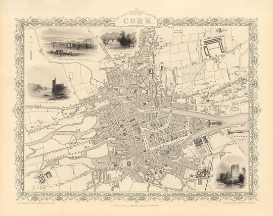 Old Map of Cork, Ireland, 1851 by Tallis & Rapkin: Victorian Quarter, Central, Popes Quay, River Lee, Munster