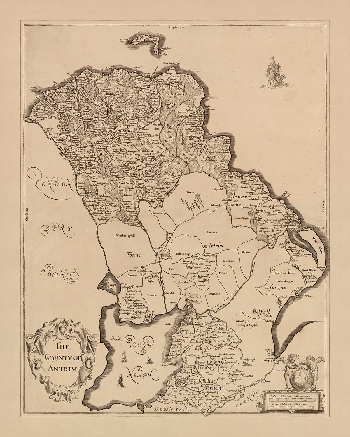 Old Map of County Antrim by Petty, 1685: Belfast, Carrickfergus, Lisburn, Randalstown