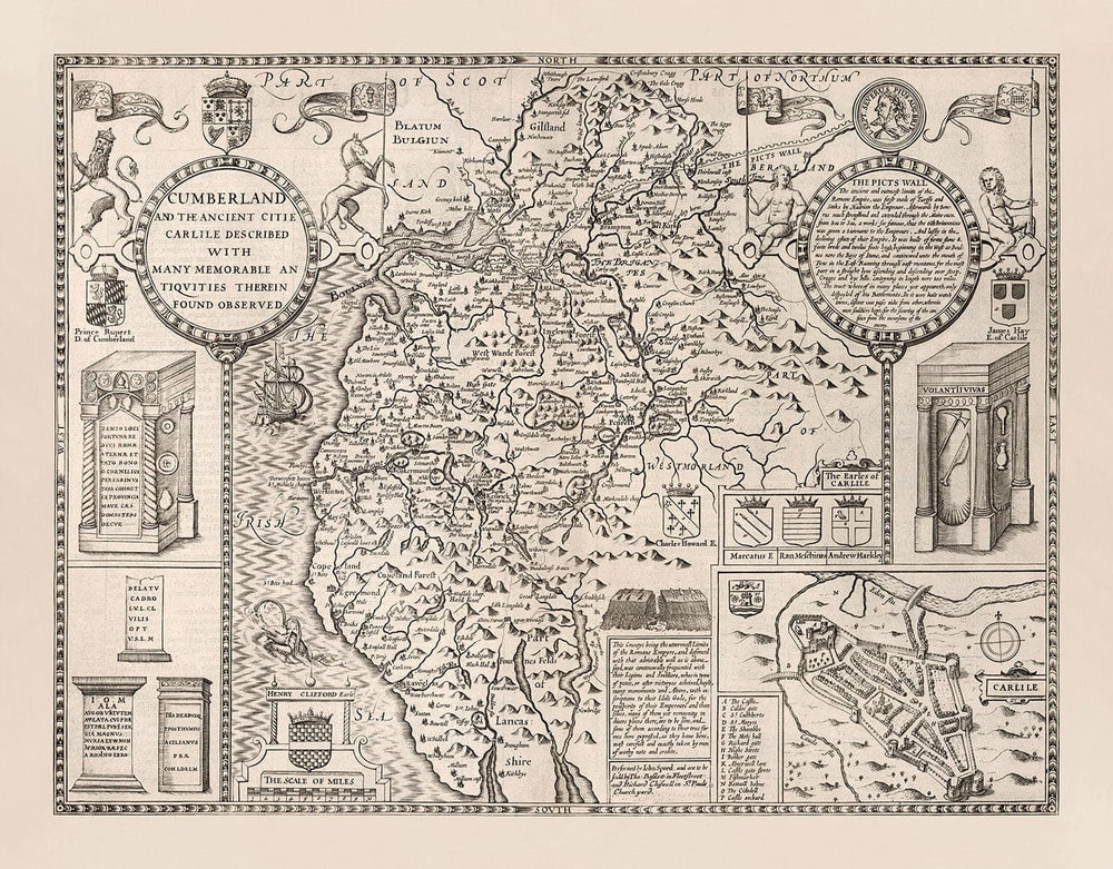 Old Map of Cumbria, 1611 by John Speed: Cumberland, Carlisle, Keswick, Lake District, Windermere, Picts & Hadrian's Wall