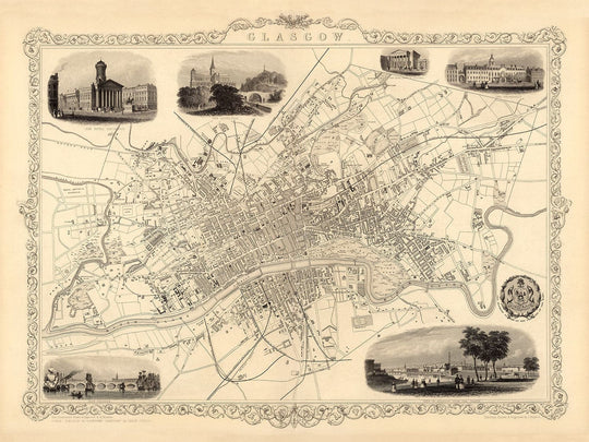 Around the edges of the map are detailed engravings of prominent buildings and landmarks in Glasgow, including The Royal Exchange, a lovely view of the Clyde with some well-to-do types strolling along it, New Bridge, Glasgow University, the Cathedral, and the Royal Bank of Scotland.