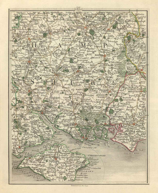 Old Map of Hampshire & Isle of Wight in 1794 by John Cary: Portsmouth, Southampton, Chichester, Havant