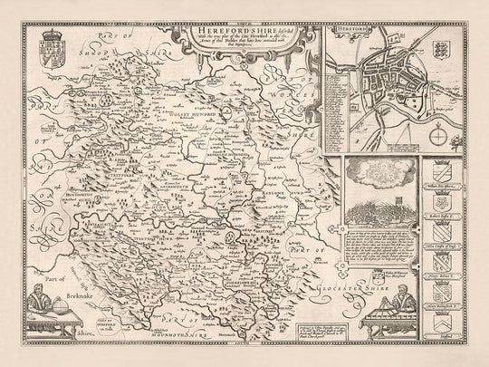 Old Map of Herefordshire by Speed, 1611: Hereford, Leominster, River Wye, Battle, Coats of Arms