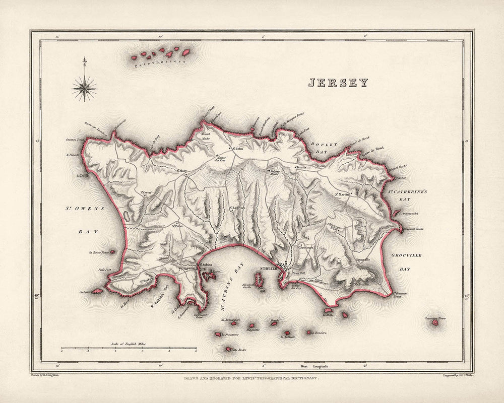 This meticulously crafted Old Map of Jersey by Samuel Lewis in 1844 offers a captivating glimpse into the historical landscape of the Island of Jersey, Channel Islands. With its intricate details and exquisite cartographic artistry, this map is a true collector's item. Featuring the main towns, cities, and other fascinating features of Jersey, this map showcases the island's rich history. It is important to note that some modern cities may not be depicted on this map, while others may appear under earlier names, adding an exciting layer of historical significance. The Old Map of Jersey by Samuel Lewis in 1844 serves as a window into the past, allowing you to explore the island's heritage and trace the evolution of its settlements. Below is a comprehensive list of 30 notable towns, cities, counties, settlements, and colonies that were founded before 1840 and were located within the historical boundaries of the Island of Jersey, Channel Islands: