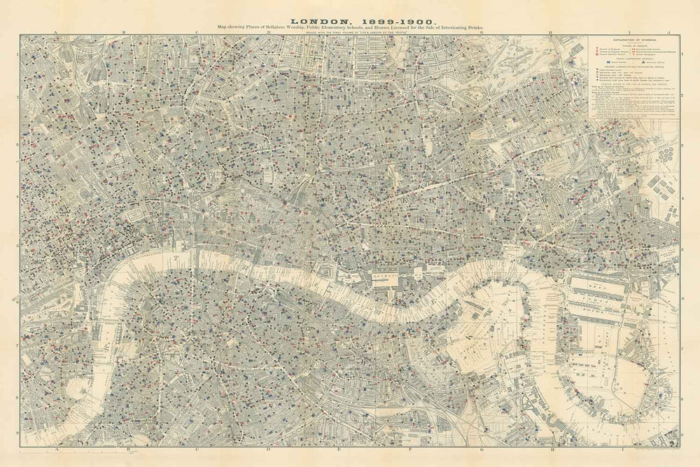 Old Map of London's Churches, Pubs and Schools in 1903 by Charles Booth: Westminster, City of London, Southwark, Isle of Dogs