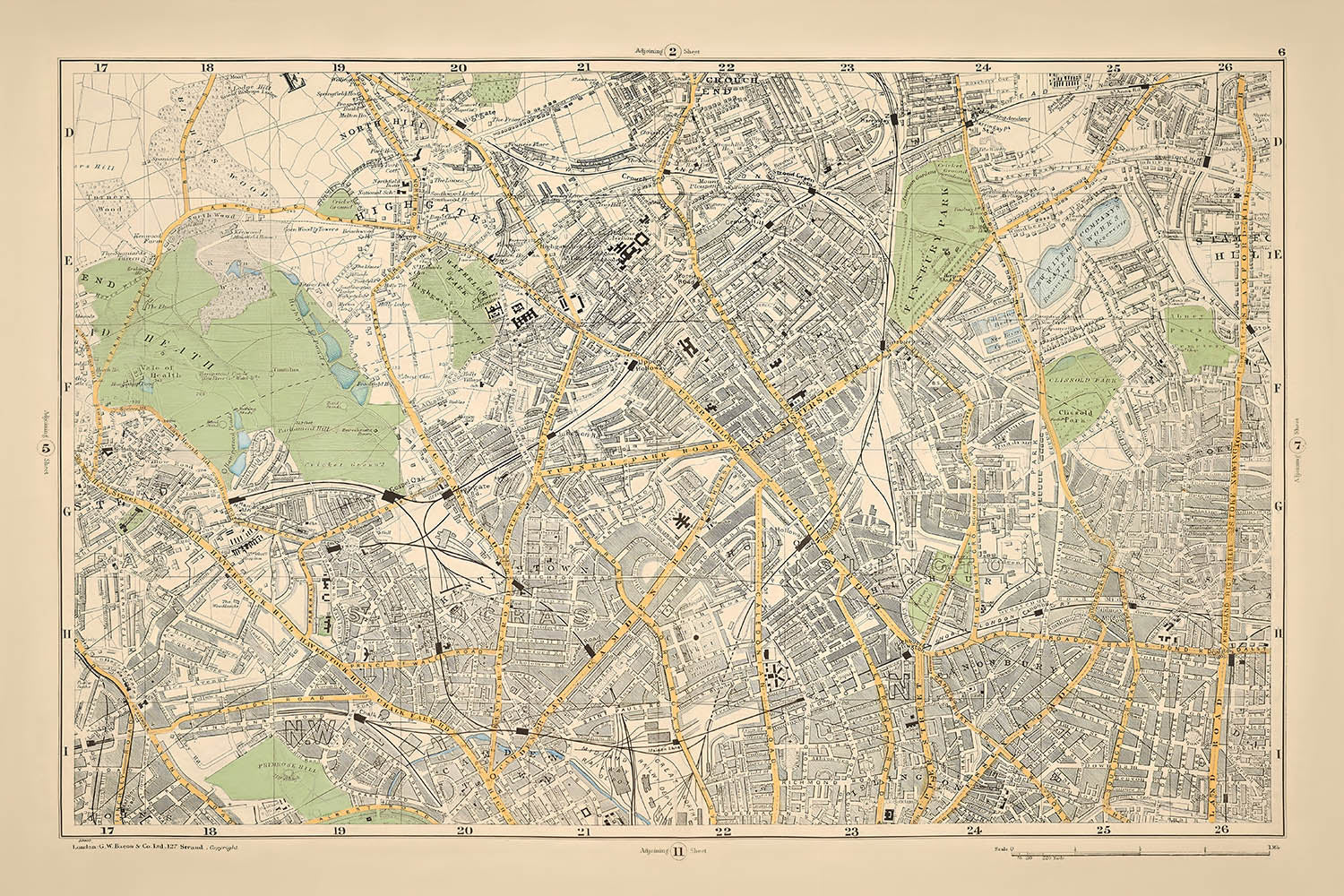 Old Map of North-Central London, 1900: Hampstead Heath, Camden, Highgate, Finsbury Park, Stoke Newington