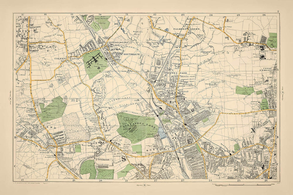 The map beautifully details significant neighborhoods such as Colney Hatch, Upper Edmonton, and Muswell Hill, each with its own story to tell. Colney Hatch, known for its asylum, provides a poignant reminder of the era's social history. Meanwhile, Muswell Hill, with its burgeoning community, reflects the growth and change that characterized London at the turn of the century. These areas, depicted with precision and care, invite you to explore the rich tapestry of North London's past.