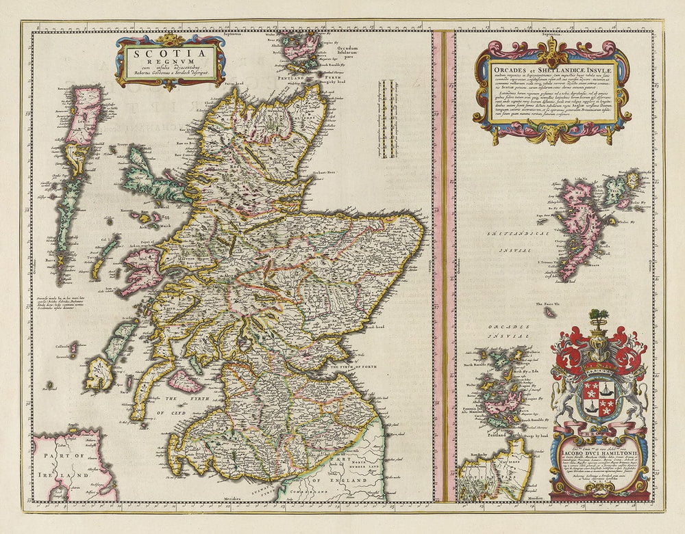 This is an exceedingly rare, old full colour map of Scotland, including the Shetland Islands and Orkney, created by master mapmaker Jean Blaeu from his workshop in Amsterdam and originally published in this Theatrum Orbis Terrarum Sive Atlas Novus in 1654. This old map is essentially two panels: Scotland on the left and Shetland Isles and Orkney on the right.