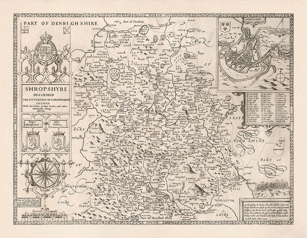 Old Map of Shropshire in 1611 by John Speed: Shrewsbury, Telford, Bridgnorth, Oswestry, Newport, Ludlow