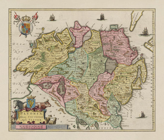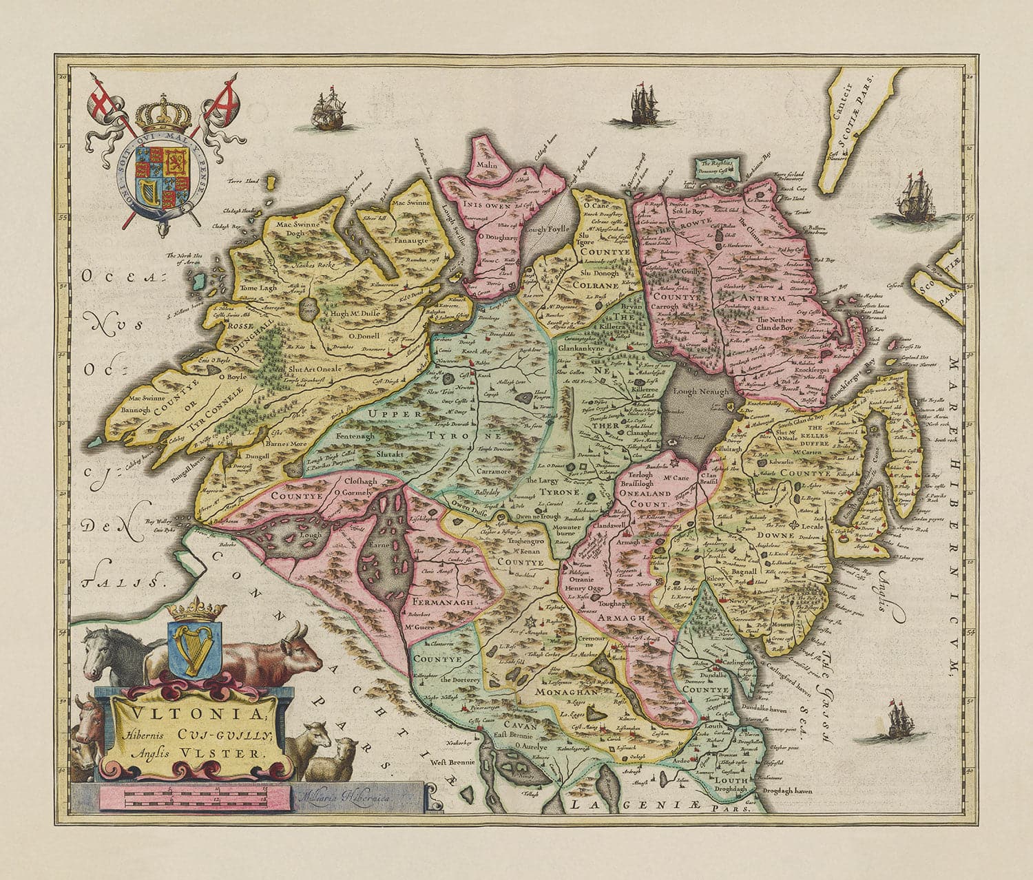 Old Map of Ulster, Northern Ireland in 1665 by Joan Blaeu: Belfast, Derry, County Antrim & Down, Eire