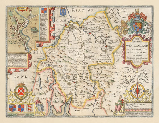In the top right is a detailed engraving of Kendal, then the county seat and previously the centre of the Barony of Kendal - which would become Westmorland.