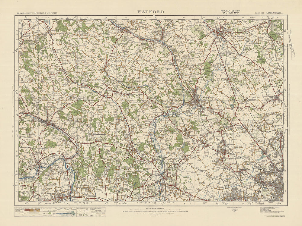 This vintage map, titled "Sheet 106 - Watford," is a remarkable piece from Ordnance Survey's One-inch "Popular" edition of England and Wales, published in 1925. The map showcases several prominent towns, cities, and fascinating features, including St Albans, Hemel Hempstead, High Wycombe, Maidenhead, and the scenic Clne Valley Regional Park.
