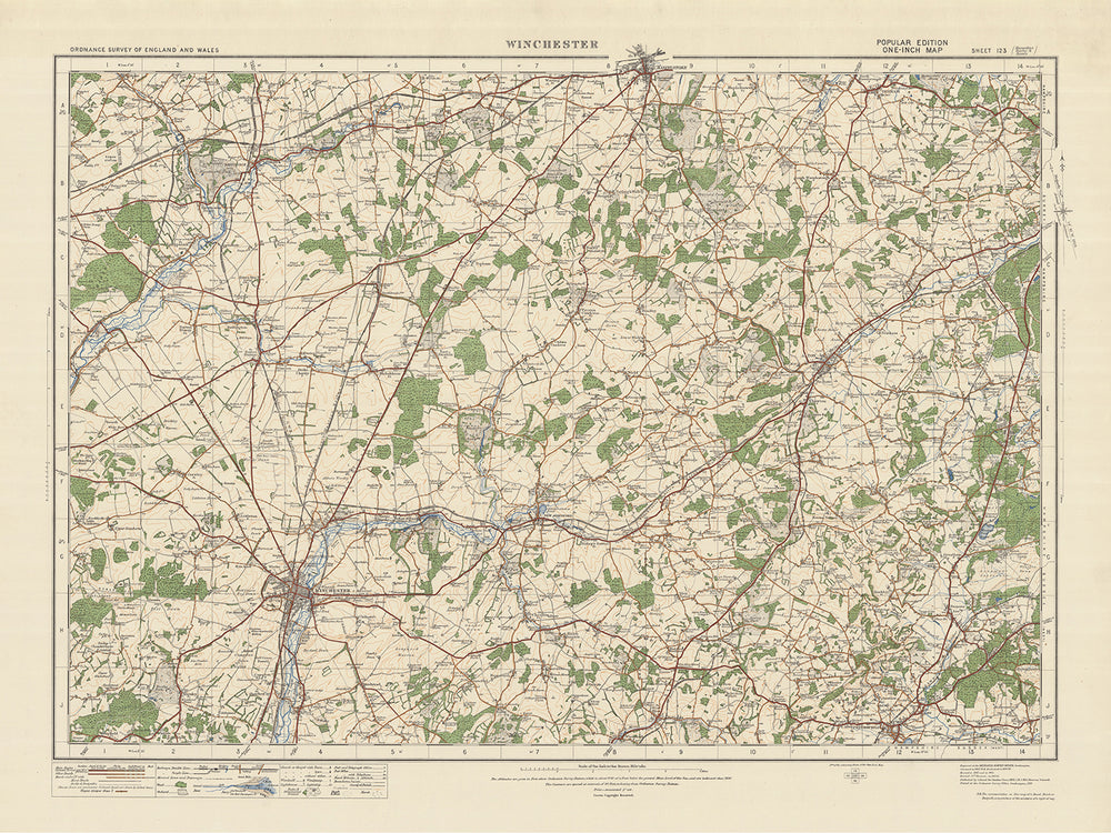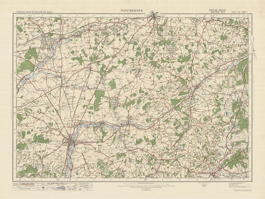 This vintage map, titled "Sheet 123 - Winchester," is part of the Ordnance Survey's One-inch "Popular" edition for England and Wales, published in 1925. The map showcases the historic city of Winchester, along with several other towns, cities, and interesting features in the surrounding area. It provides a fascinating glimpse into the landscape, settlements, and boundaries of the region during the early 20th century.