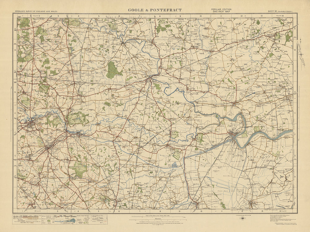 This Old Ordnance Survey Map, Sheet 32 - Goole & Pontefract, published in 1925, offers a fascinating glimpse into the historical landscape of England and Wales. Spanning an area that includes the towns of Goole and Pontefract, as well as Castleford, Knottingley, Selby, Howden, and Snaith, this map provides a wealth of information for history enthusiasts, cartographers, and those with a keen interest in the region's past.