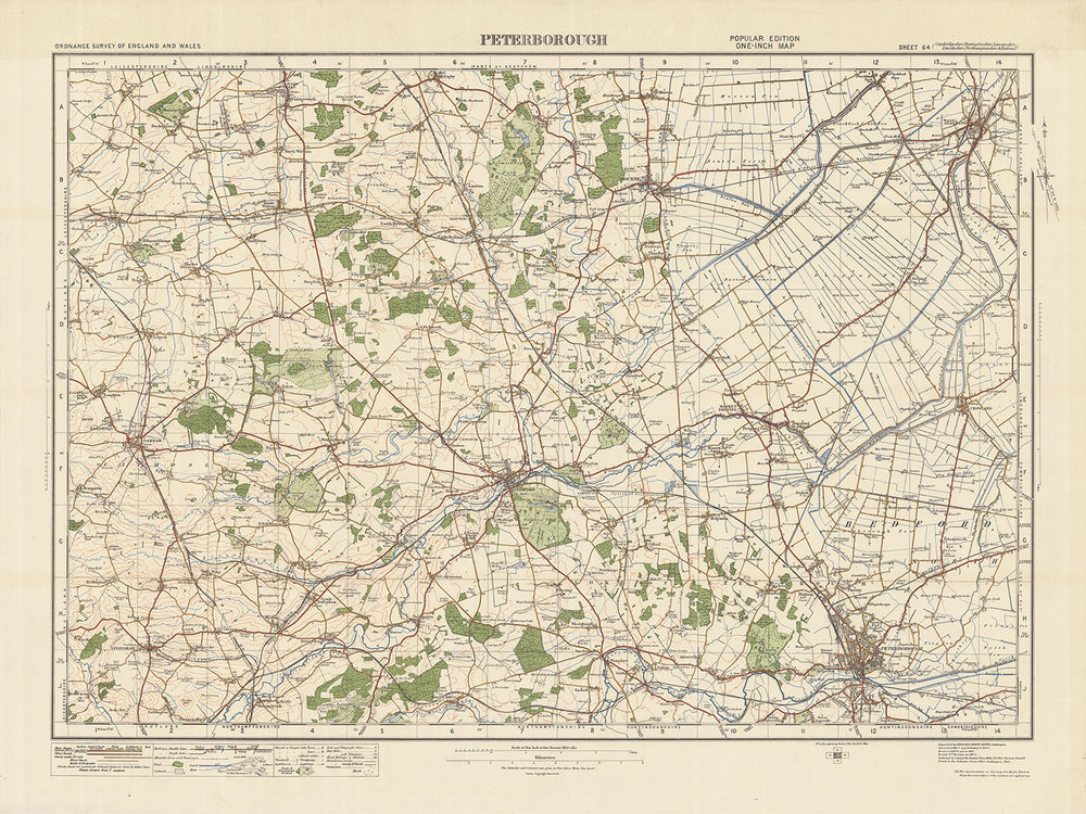 This meticulously detailed map, titled "Sheet 64 - Peterborough," is a fascinating piece from Ordnance Survey's One-inch "Popular" edition, England and Wales, published in 1925. The map showcases various towns, cities, and interesting features, including Peterborough itself, as well as Stamford, Oakley, Bourne, Spalding, and the renowned Burghley House.