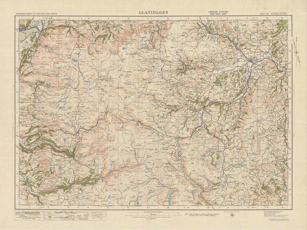 This fascinating old map, titled "Sheet 69 - Llanidloes," is part of the Ordnance Survey's One-inch "Popular" edition for England and Wales, published in 1925. The map showcases the historic county of Montgomeryshire, where the town of Llanidloes is situated. Llanidloes, a charming market town, serves as the central point of interest on this map. However, it is not the only noteworthy location depicted. The map also features several other towns, cities, and remarkable features that make it a valuable piece for history enthusiasts and cartography aficionados alike.