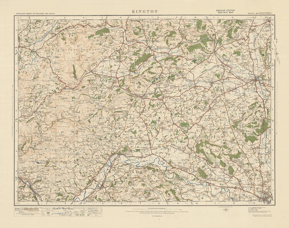 The "Sheet 80 - Kington" map from Ordnance Survey's One-inch "Popular" edition, England and Wales, published in 1925, is a fascinating piece of cartographic history. This meticulously detailed map showcases the towns, cities, and interesting features of the region, including Kington, Leominster, Hereford, Presteigne, Hay-on-Wye, and New Radnor.