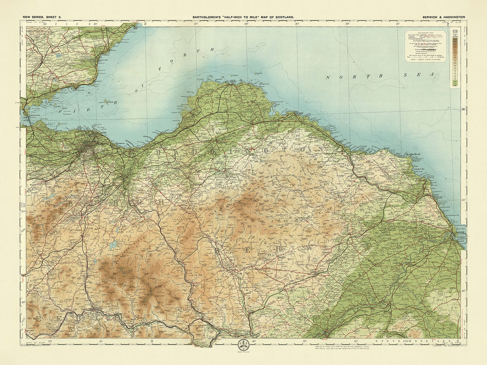 JG Bartholomew's "Sheet 9 - Berwick & Haddington" is more than just a map; it is a window into the past, capturing the historical and geographical essence of a bygone era. Whether you are a history enthusiast, a lover of cartography, or simply someone who appreciates the beauty of detailed craftsmanship, this map offers a fascinating journey through time and space. Its intricate details and historical significance make it a treasured piece for any collection, evoking the spirit of exploration and discovery that defined the early 20th century.