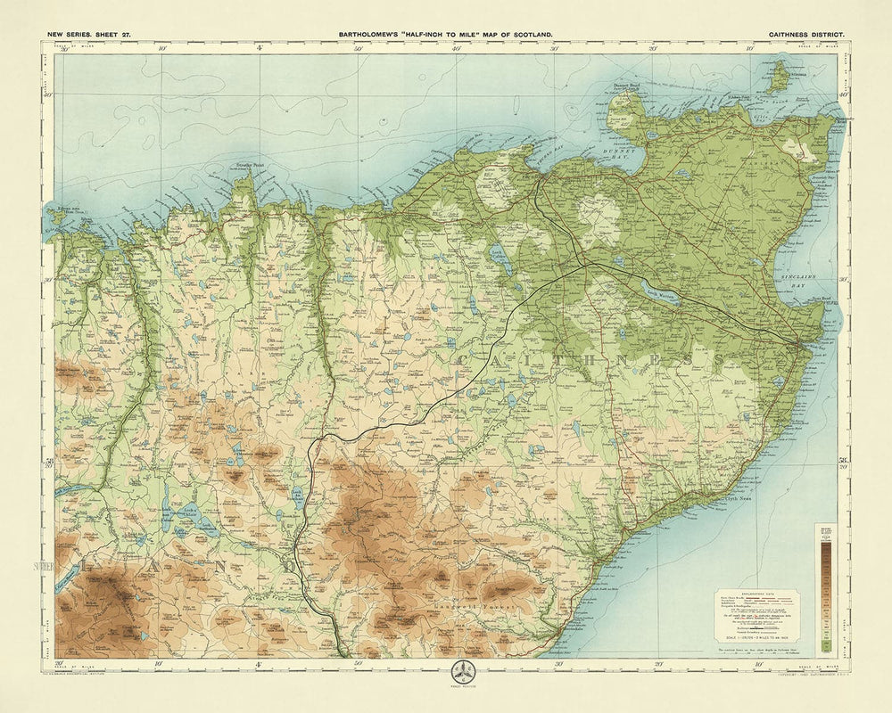 Sheet 27 - Caithness District, crafted by the esteemed J.G. Bartholomew in 1901, stands as a testament to the golden age of cartography. This half-inch to the mile scale map (1:126,720) captures the essence of the Caithness District in Scotland with unparalleled clarity and detail. Bartholomew's innovative use of colour gradation to depict landscape relief transforms this map into both a practical tool and a work of art. The subtle layers of colour vividly represent the varying elevations, making the physical geography of the region come alive for cyclists, tourists, and map enthusiasts alike.