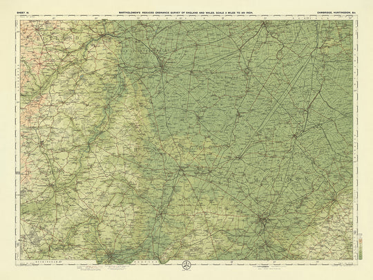 Sheet 19 - Cambridge, Huntingdon, crafted by the esteemed cartographer JG Bartholomew in 1901, is a masterful representation of early 20th-century cartographic artistry. Bartholomew, known for his meticulous attention to detail and innovative use of color, created this map as part of his flagship half-inch series. The map's scale of 1:126,720 makes it a detailed and accurate depiction of the regions it covers, providing a fascinating glimpse into the geographical and infrastructural layout of the time. Bartholomew's work was highly regarded among cyclists and tourists, making this map not only a tool for navigation but also a piece of art to be admired.