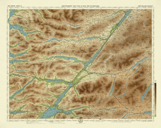 The map's design is a marvel of cartographic innovation, utilizing subtle gradations of colour to depict the varied landscape relief. This technique allows the viewer to easily discern the heights and depths of the region's topography, from the towering peaks of Ben Nevis and Aonach Mòr to the serene valleys of Glen Nevis and the Great Glen. The careful use of colour bands creates a three-dimensional effect, bringing the rugged beauty of the Scottish Highlands to life. This map is based on a reduced Ordnance Survey map of the same period, ensuring both accuracy and historical authenticity.