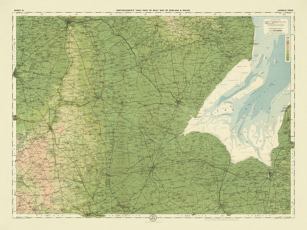 The map is rich with notable features, including the River Witham, the River Welland, and the Fossdyke Navigation, which have played crucial roles in the region's history and development. The Wash, a large estuary, is prominently displayed, along with its sand and shingle banks and surrounding salt marshes. These natural phenomena are meticulously detailed, reflecting Bartholomew's commitment to accuracy and his deep understanding of the landscape. The map also features ancient Roman infrastructure, such as the Car Dyke, adding a layer of historical depth.