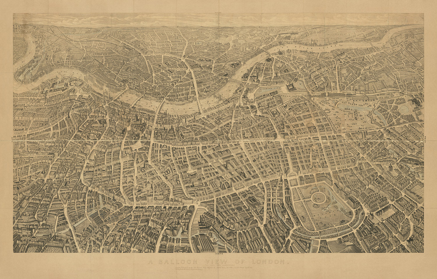 Old Pictorial Map of London by Henry Banks, 1851: "A Balloon View" of Buckingham Palace, St Paul's, Parliament, Hyde Park, etc.