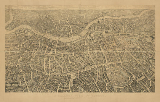 This 1851 map, titled "A Balloon View of London (As Seen From Hampstead)", offers a unique perspective of the city, as if viewed from a hot air balloon floating above Hampstead Heath. This remarkable vantage point provides an unparalleled view of London's urban landscape during a period of rapid growth and transformation.