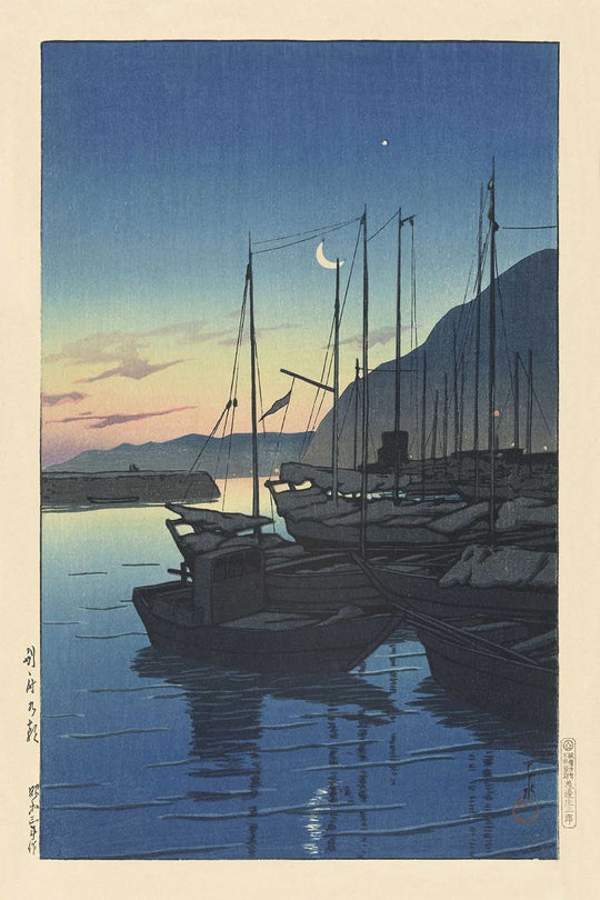The artwork is notable for its exquisite play of colors—gentle blues and greens couple with the soft warm hues of dawn, creating a tranquil and immersive scene. The delicate balance of light and shadow invites viewers into a moment of reflective peace. Owning a print of Morning in Beppu allows you to bring a piece of Japan's idyllic beauty and Kawase’s artistic legacy into your space.