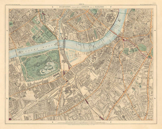 The map was originally published in 24 sheets. Altogether the map would've measured about 2 metres wide (78 inches). This here is sheet 14, which focuses on Battersea and Chelsea and the south London boroughs of Wandsworth, Lambeth and Kensington and Chelsea.