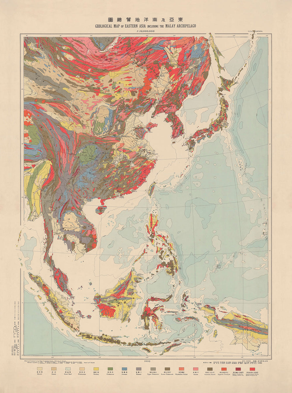 This wonderful old map of the Geology of East Asia was originally published in 1932. It was created by Tokyo Geology Society.