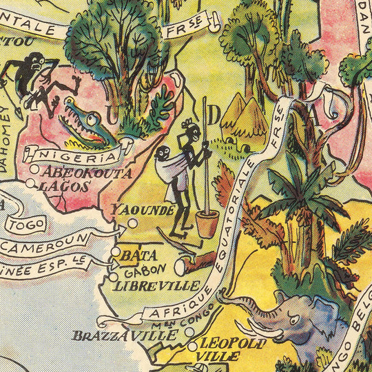 The design and style of "Afrique" are a testament to Liozu's artistic prowess and his ability to blend cartography with illustration. The map features vibrant colors and intricate illustrations of local wildlife and agricultural activities, making it not just a tool for navigation but a piece of art. The decorative borders, featuring flags of various countries, add an extra layer of historical context, reminding viewers of the international influences and connections that have shaped Africa's history.