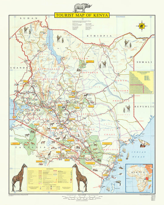The map's design is a feast for the eyes, employing a pictorial style that brings Kenya's diverse ecosystems and wildlife to life. Illustrations of majestic animals such as lions, elephants, and rhinos dot the landscape, inviting viewers to explore the natural habitats that make Kenya a haven for wildlife enthusiasts. Beyond its aesthetic appeal, the map is a rich repository of information, detailing roads, railways, airports, and tourist attractions, making it an invaluable resource for adventurers and scholars alike. The inclusion of neighboring countries Uganda, Tanzania, Somalia, Ethiopia, and Sudan provides context to Kenya's geographical and cultural landscape, emphasizing its role as a pivotal nation in East Africa.