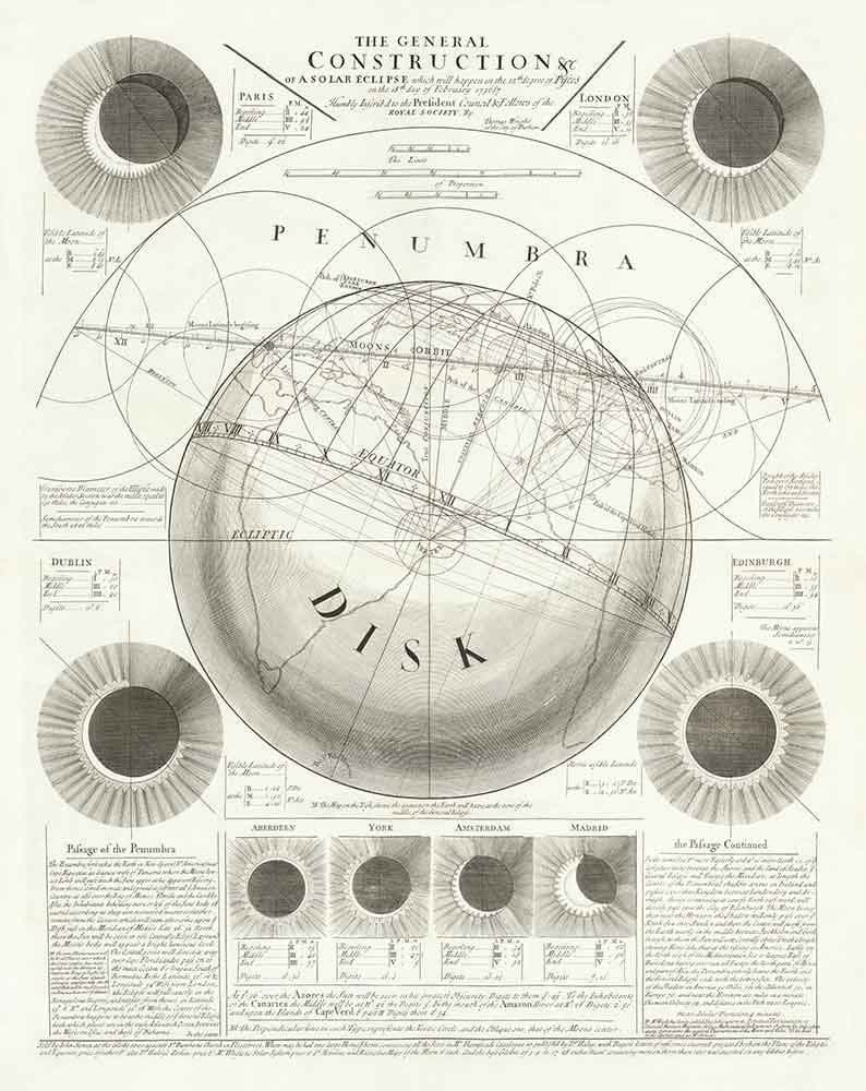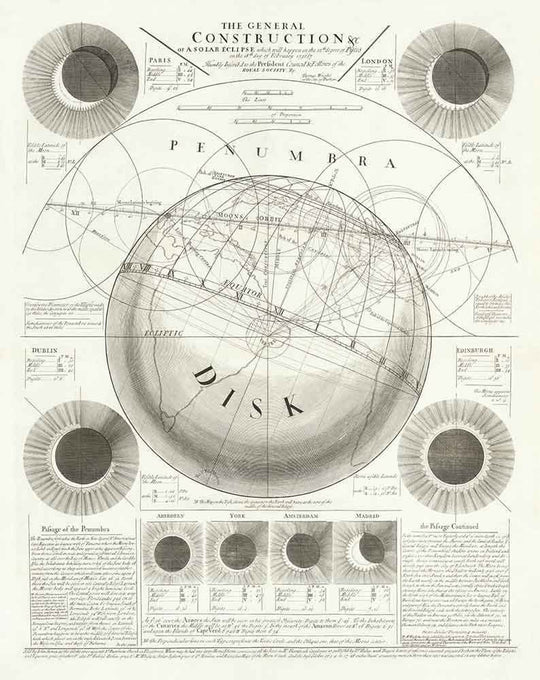 A fascinating and rare chart illustrating the path of the solar eclipse of February 18, 1737. The chart was created by astronomer Thomas Wright and published by John Senex, then one of the most notable publishers of astronomical materials.