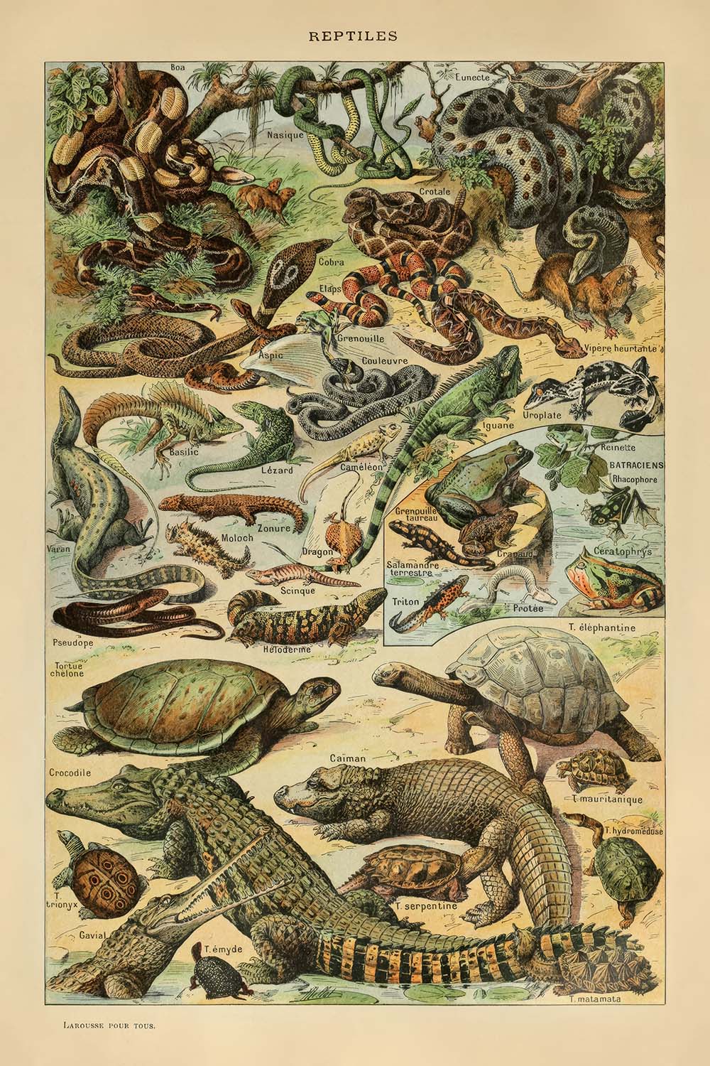Adolphe Millot's "Reptiles" is an exquisite Victorian zoological illustration originally created in 1890 for the renowned French encyclopedia, "Le Larousse pour tous: nouveau dictionnaire encyclopédique." This remarkable artwork displays a meticulous and scientifically accurate portrayal of various reptilian species, each carefully drawn and labeled in French, embodying both the scientific curiosity and artistic elegance characteristic of the Victorian era.