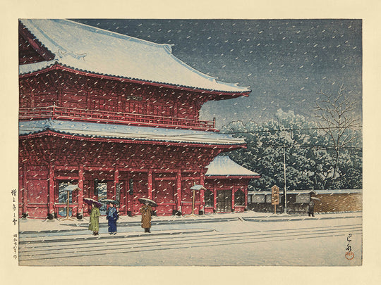 Discover the timeless beauty of "Snow at Zojoji Temple in Tokyo" by Hasui Kawase, an exceptional masterpiece from 1935 capturing the tranquil spirit of Japan’s ukiyo-e tradition. Known as 増上寺の雪 (Zojoji no Yuki) in Japanese, this iconic woodblock print encapsulates the serene splendor of Zojoji Temple blanketed under a gentle snowfall—a scene touched with poetic calm and architectural grace. Hasui Kawase, celebrated as a key figure of the shin-hanga (“new prints”) movement, devoted his career to reimagining Japanese landscapes with luminous colour, soft atmospheres, and evocative seasonal moods.