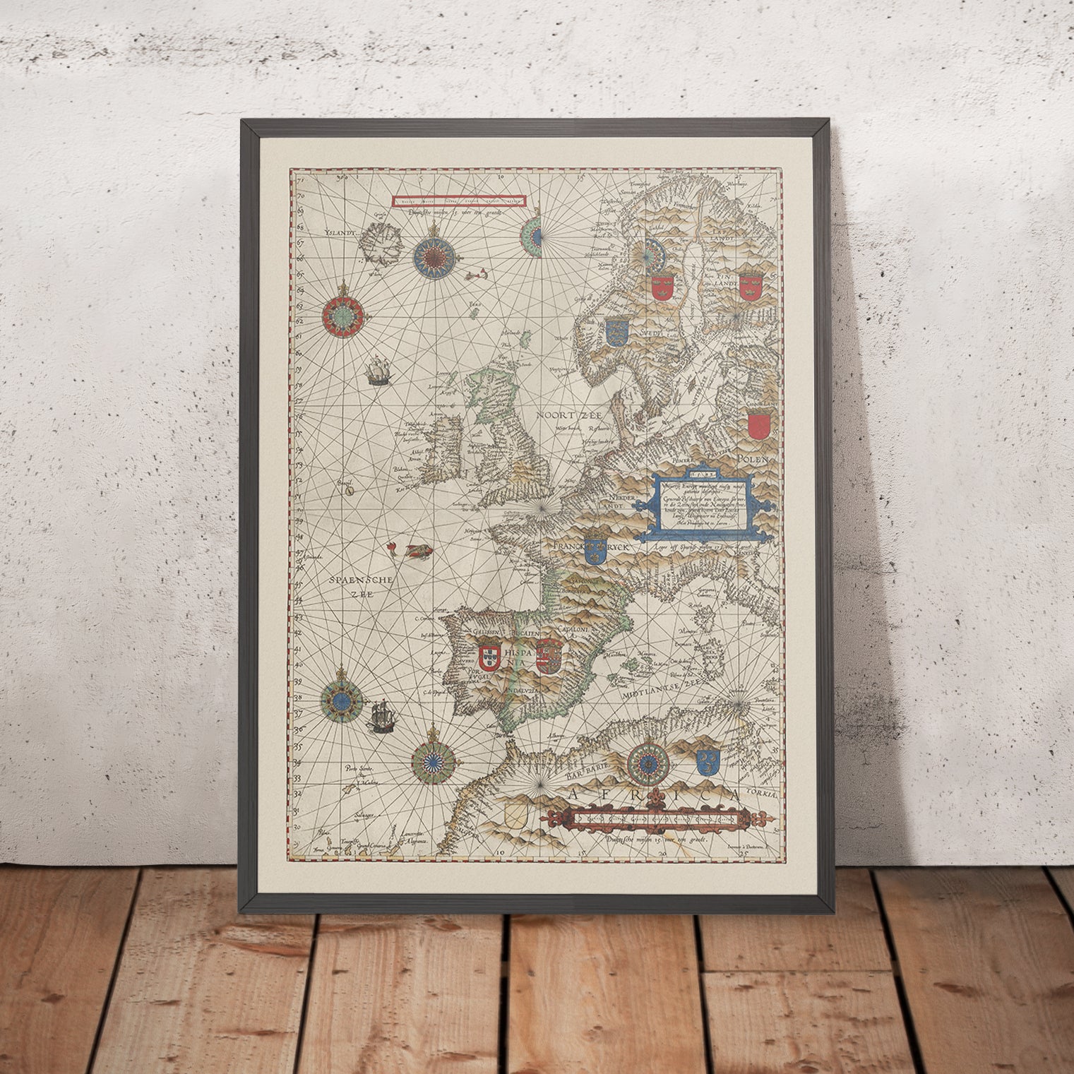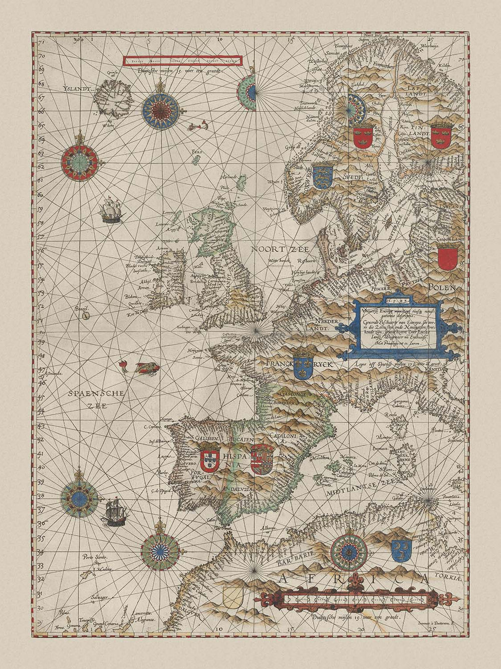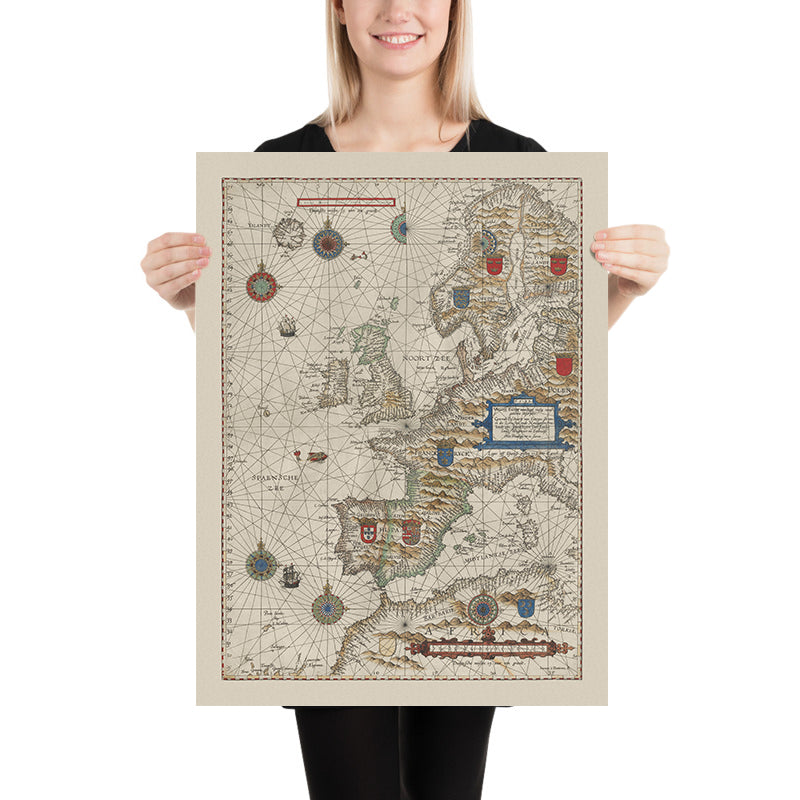 Universe Europe maritime eiusque navigationis descriptio is the commanding title of Lucas Janszoon Waghenaer’s pioneering sea chart, issued in 1584 at the dawn of Europe’s oceanic enterprises. It assembles the coasts of the British Isles and Scandinavia, the stormy North Sea, the “Spanish Sea” of the western Mediterranean, the littoral of North Africa, and the open reaches of the Atlantic into a single navigational picture. A dense web of rhumb lines radiates between ornate compass roses, translating magnetic bearings into straight-line courses for pilots, while Latin annotations lend scholarly precision. As the earliest printed sea chart of this broad theatre, it announced a new, standardized language for sailing the edges of Europe and navigating between the continent’s rival maritime powers.