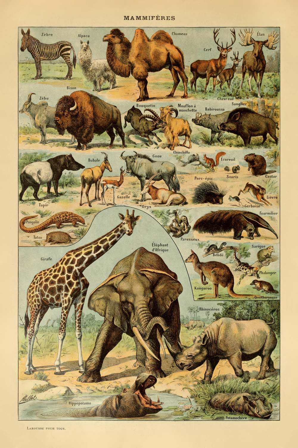 Mammals (1) by Adolphe Millot, 1890 - Hooved Animals, Marsupials