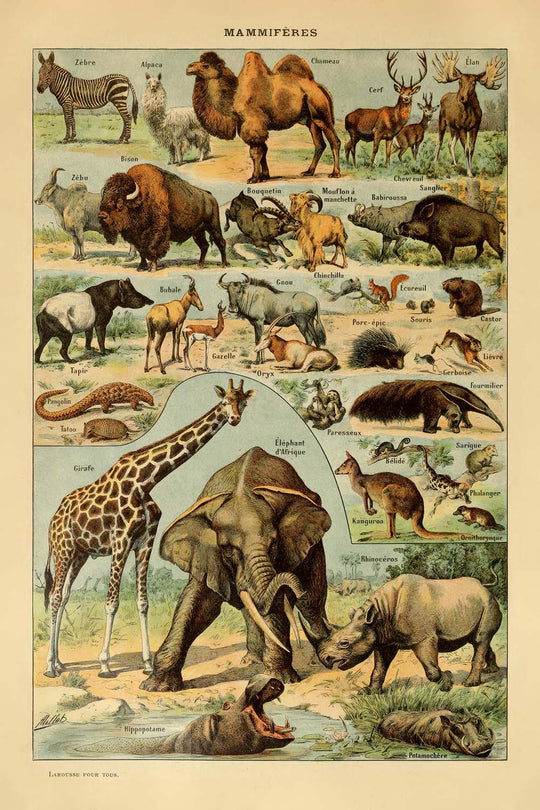 This exquisite Victorian zoological illustration, "Mammals (1)" by renowned French artist Adolphe Millot, provides a fascinating insight into the rich diversity of mammals as understood in the late 19th century. Originally published in 1890 in the acclaimed French encyclopedia "Le Larousse pour tous: nouveau dictionnaire encyclopédique," this artwork beautifully combines scientific precision with the refined charm of Victorian natural history illustration.