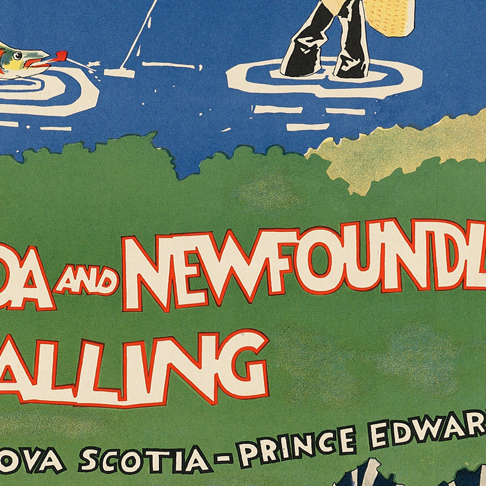 “Eastern Canada and Newfoundland are Calling” by John Held Jr. (1926) is a joyous Jazz Age travel poster inviting New Englanders north to the Canadian Maritimes. Created at the height of the golden era of rail and steamship tourism, it promotes holidays in Québec, New Brunswick, Nova Scotia, Prince Edward Island, and Newfoundland—then still a separate dominion. Held’s playful scene unfurls from a deep-blue lake to a dusky horizon: a fisherman coaxes a red‑spotted trout from the water, a camper tends a crackling fire as smoke curls in cartoon swirls, a canoeist shoulders a gleaming green hull on a portage, and a moose silhouettes against the skyline while Canada geese glide across the water. The hand-lettered headline, in white with bright red shadowing, gives the poster its irresistible call to adventure.