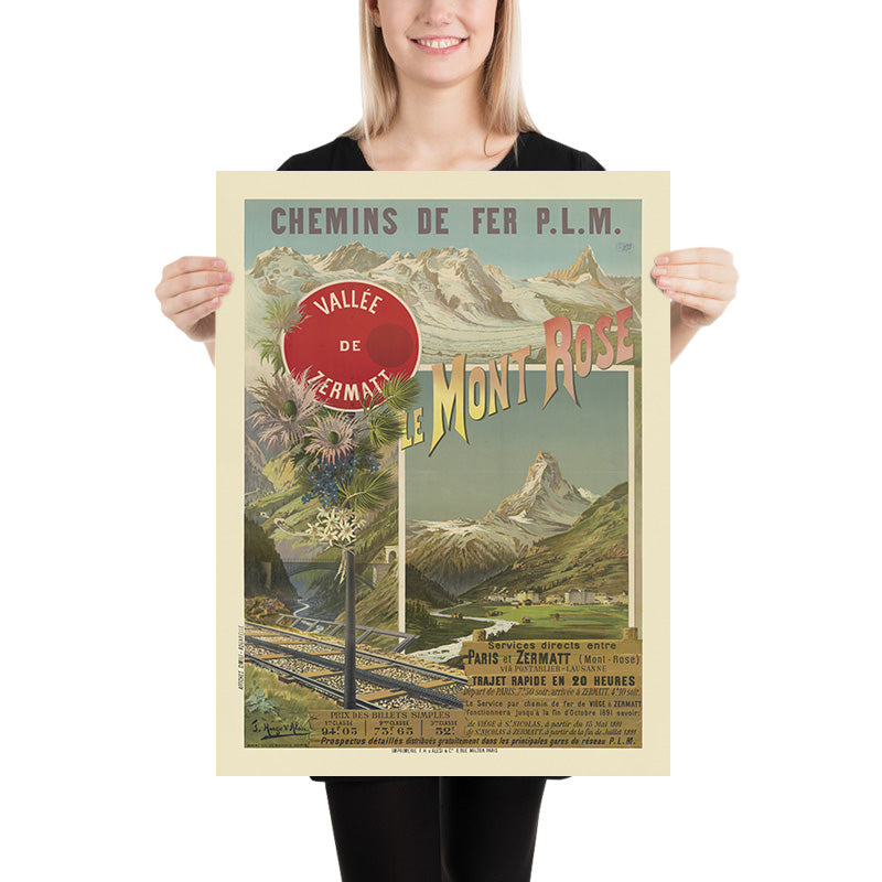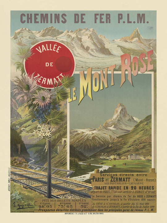 Chemins de fer P.L.M. — Le Mont Rose. Vallée de Zermatt by Frédéric Hugo d’Alesi (1891) captures the glamour of Belle Époque rail travel to Switzerland’s high Alps. Created for the Paris–Lyon–Méditerranée railway, the poster invites travelers to Zermatt and the Monte Rosa massif with a dramatic alpine vista: the crisp, triangular silhouette of the Matterhorn rises over a green valley, while bold yellow‑to‑rose letterforms spelling “Le Mont Rose” sweep across a blue sky. A red enamel‑style roundel reading “Vallée de Zermatt” punctuates the upper left, and a stone viaduct, rushing river, and glinting tracks carry the eye toward the mountains.