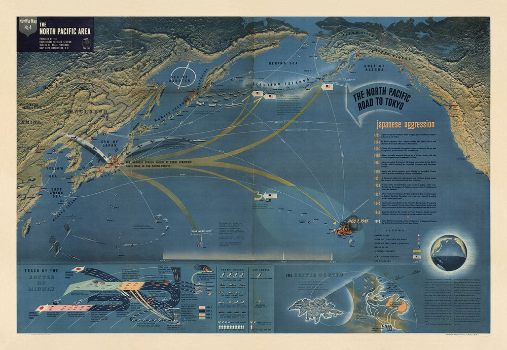 There are 6 maps in the series, each focusing on a different aspect or theatre of World War 2. This map, No. 4, focuses on the Pacific Theatre and the "timeline of Japanese Aggression" in the region from 1895 through until the Pearl Harbour attack in 1941.